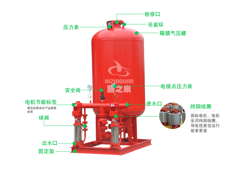 消防自動(dòng)增壓穩壓給水設備是為消防滅火工程配套的設備,主要作用:保持水滅火管網(wǎng)的消防壓力,發(fā)生火警打開(kāi)水滅火設備能立即噴出充實(shí)水柱,給報警聯(lián)動(dòng)啟動(dòng)大消防泵贏(yíng)得30秒以上的初期滅火撲救時(shí)間,直至消防主泵全負荷啟動(dòng)進(jìn)行,由于該設備能始終保持管網(wǎng)壓力,使管網(wǎng)不存空氣啟動(dòng)大消防泵不打嗆管網(wǎng)無(wú)顫動(dòng)危險。并獲得消防產(chǎn)品3CF認證證書(shū)。