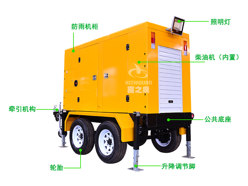 2.單級式移動(dòng)泵車(chē)主要由真空輔助裝置、柴油機動(dòng)力包、柴油機專(zhuān)用油箱、泵傳動(dòng)系統、設備底座、自吸泵總成、防雨設施、起動(dòng)裝置、起動(dòng)電源裝置、進(jìn)水管總成、出水管總成、二輪移動(dòng)拖車(chē)系統、快速起吊裝置等組成。